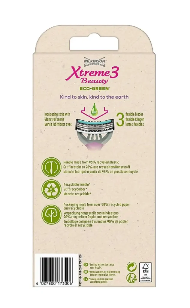 Der Griff besteht zu 95 % aus recyceltem Kunststoff und die Verpackung zu 90 % aus Recyclingpapier. Die Packung enthält 4 Einwegklingen.